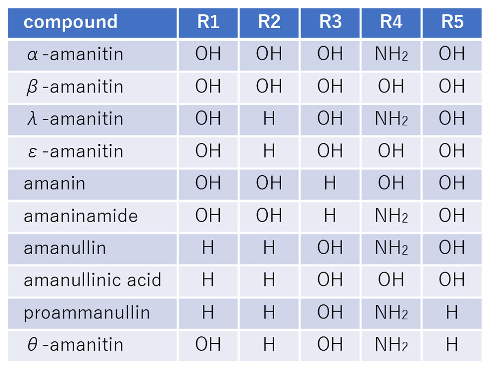 アマトキシン類(amatoxins;α-amanitin など),ファロトキシン類(phallotoxins;phalloidin,phallacidinなど),ジヒドロキシグルタミン酸,ビロトキシン類